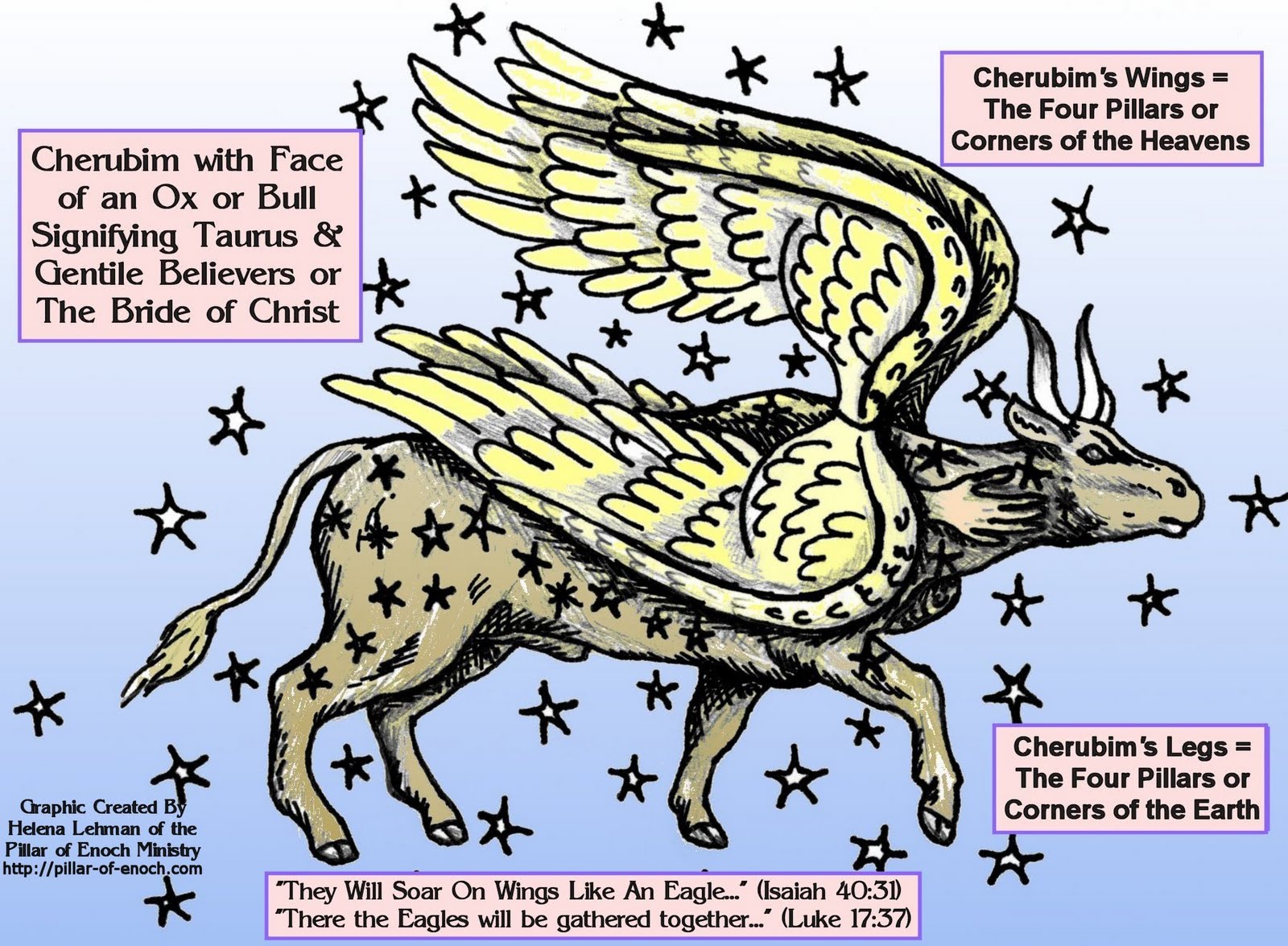 With their four legs and four wings, these heavenly beings mark the four corners of the heavens and the Earth. Furthermore, these Cherubim’s faces allude to the four cardinal signs in the Gospel in the Stars: Taurus the Ox or Bull, Aquarius the Man, Scorpio the Eagle, and Leo the Lion, and their eyes signify the stars of the heavens, which in turn signify the angels and saints that love and follow Yahweh. In addition, the Body of the Ox or Bull signifies Gentile Believers that will form the Body and Bride of Christ. Likewise, recalling my article “A Gathering of Eagles - A Hidden Parable” (Link: http://pillar-of-enoch.com/essays/index.html#Eagles), the Eagle’s wings could signify the gathering of the Eagles that Yahshua will do at the First Rapture: